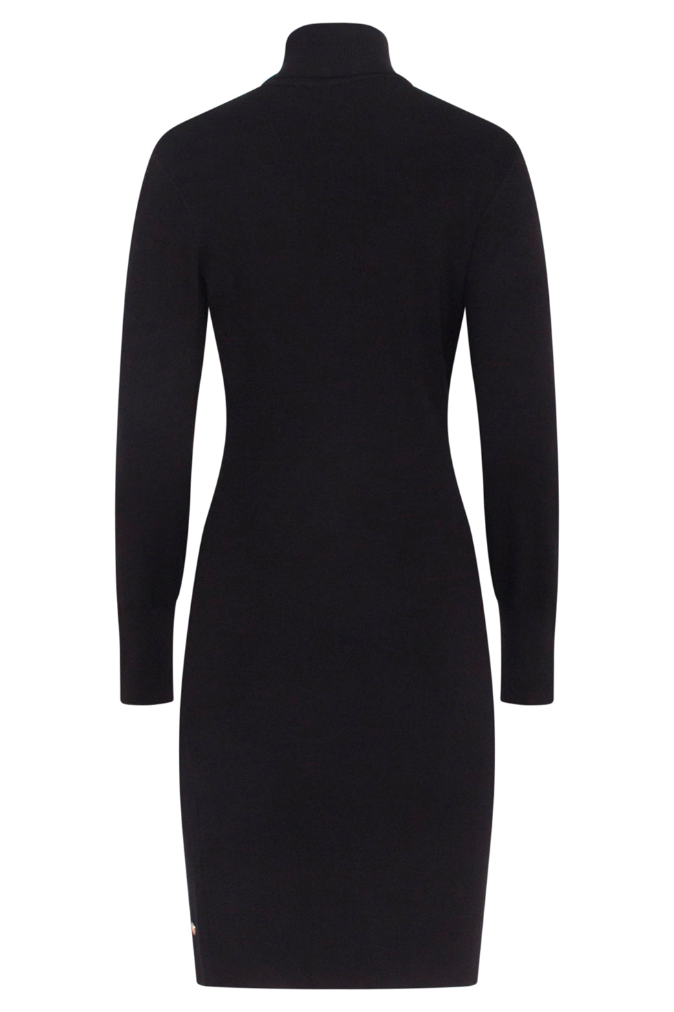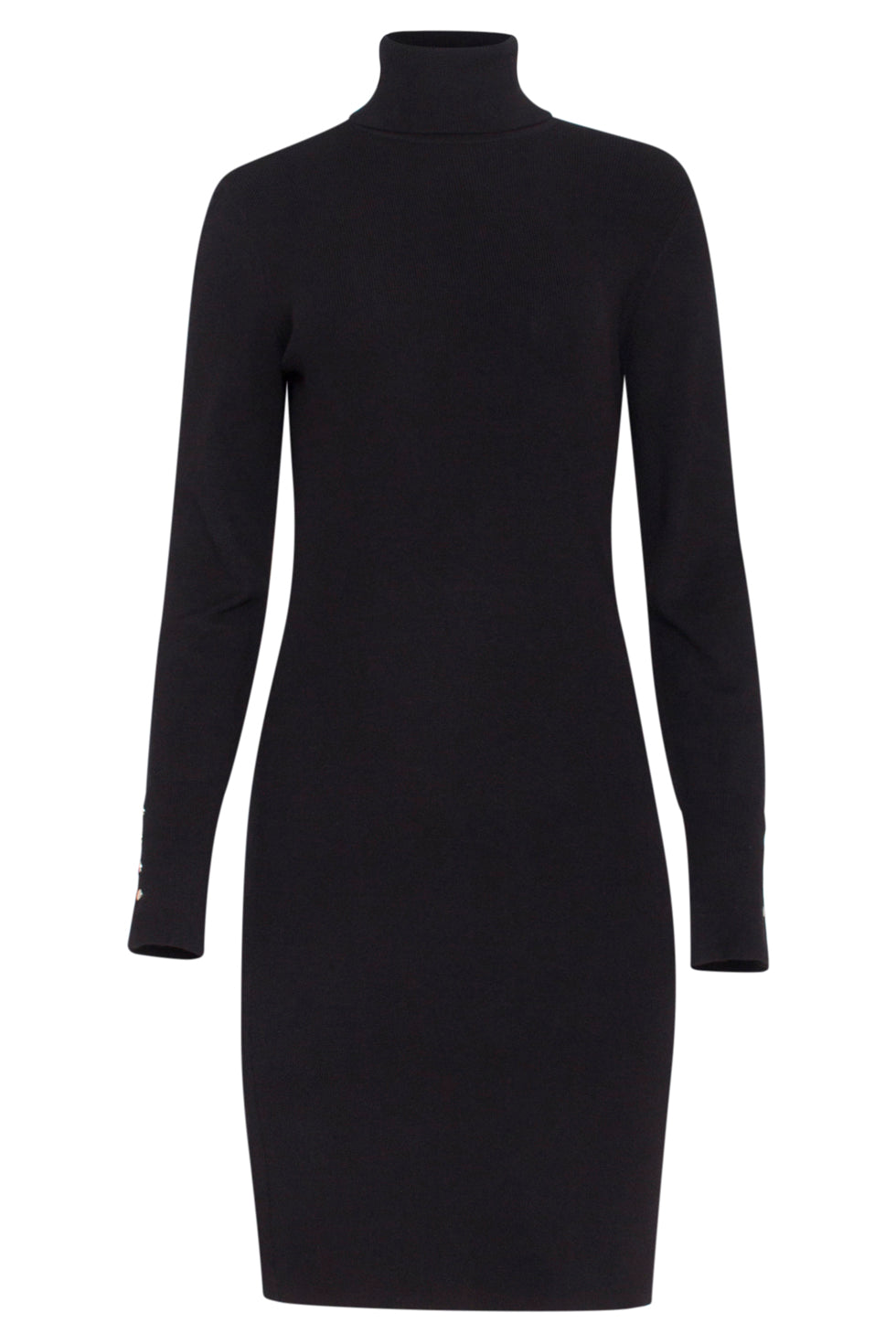 Das Highlight dieses Kleides sind die goldenen Knopfdetails an den Manschetten, die dem zeitlosen schwarzen Design einen Hauch von Luxus und Raffinesse verleihen. Der Rollkragen sorgt nicht nur für zusätzliche Wärme, sondern auch für einen schicken und eleganten Look.